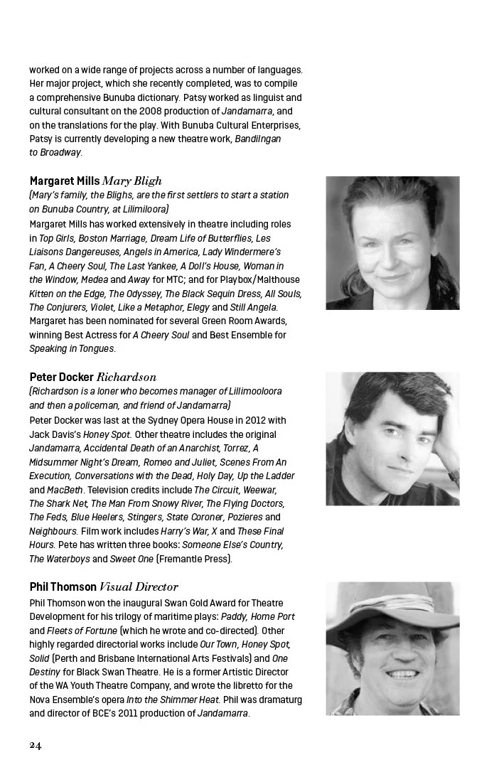 “Actors Patsy Bedford and Margaret Mills were full of warmth, character and emotion. The moment when they came together as one and started the Dirrari lament for the fallen Jandamarra was deeply poignant … Emmanuel Brown was an excellent Jandamarra, here, there and everywhere – including the organ loft ... an enclave of Bunuba singers and musicians offer[ed] evocative vocal and percussive contributions.”